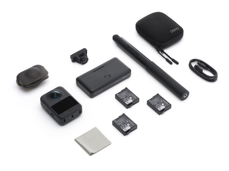| Continut pachet | 1 x DJI Osmo 360; 3 x Baterie Osmo Action Extreme; 1 x Cablu USB-C - USB-C PD; 1 x Husa de protectie; 1 x Laveta pentru curatarea lentilei; 1 x Protectie din cauciuc pentru obiectiv; 1 x Adaptor cu eliberare rapida; 1 x Selfie stick invizibil 1.2m; 1 x Carcasa multifunctionala pentru baterii Osmo |