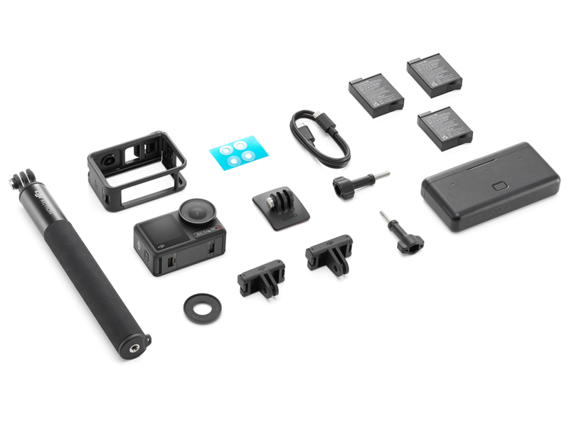 | Continut pachet | 1 x DJI Osmo Action 4; 3 x Baterie Osmo Action Extreme; 2 x Adaptor cu eliberare rapida; 1 x Banda adeziva curbata; 2 x Surub de blocare; 1 x Cablu USB-C - USB-C PD; 1 x Pad anti-alunecare; 1 x Cadru de protectie; 1 x Protectie din cauciuc pentru obiectiv; 1 x Carcasa multifunctionala pentru baterii Osmo Action; 1 x Tija extensie 1.5m Osmo |