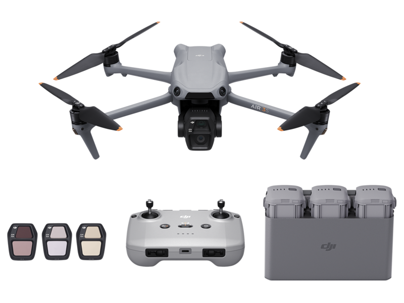 | Continut pachet | 1 x Drona DJI Air 3S; 1 x Telecomanda DJI RC-N3; 3 x Baterie inteligenta DJI Air 3S; 1 x Protectie gimbal; 1 x Cablu conector USB-C; 1 x Cablu conector Lightning; 3 x Elice de rezerva DJI Air 3S (pereche); 1 x Cablu de date USB-C - USB-C PD; 1 x Set filtre ND DJI (ND8/32/128); 1 x Hub de incarcare DJI Air 3S; 1 x Geanta de umar |